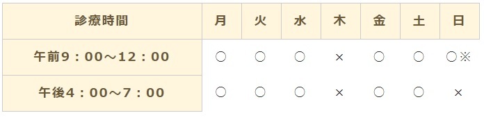 | 診療時間 | 午前9:00~12:00 午後4:00~7:00 |